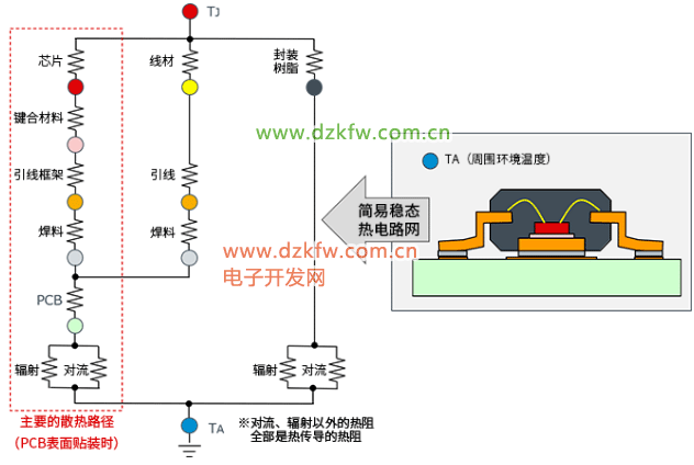 上图右上方的IC截面图中,每个部分的颜色与电路网圆圈的颜色相匹配(例如芯片为红色)。芯片温度TJ通过电路网中所示的热阻达到环境温度TA。