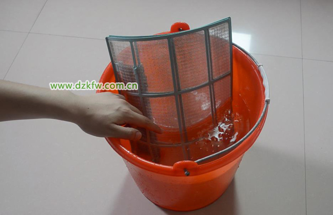 第三步,将抽出来的空调过滤网放在水桶里面浸泡10分钟。此时,过滤网上面的污渍就会慢慢瓦解溶解到水里去了。