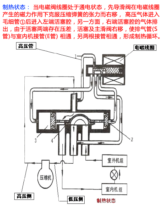 空调制热状态: 当电磁阀线圈处于通电状态,先 导滑阀在电磁线圈产生的磁力作 用下克服压缩弹簧的张力而右移, 高压气体进入毛细管①后进入左 端活塞腔,另一方面,右端活塞 腔的气体排出,由于活塞两端存 在压差,活塞及主滑阀右移,使 排气管(S管)与室内机接管(E管) 相通,另两根接管相通,形成制 热循环。