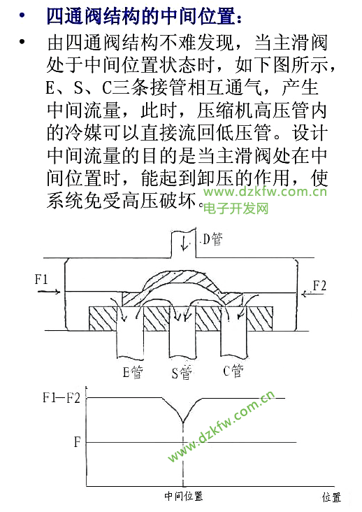 四通换向的基本条件是活塞两端的压力差(F1—F2)必须大于摩擦阻力f,否则,四通阀将 不会换向。换向所需的最低动作压力差是靠系统流量来保证的。当左右活塞腔的压力差大 于摩擦阻力f时,四通阀换向开始,当主滑阀运动到中间位置时,四通阀的E、S、C三条接 管相互导通,压缩机排出的冷媒从四通阀D接管直接经E、C接管流向S接管(压缩机回气 口),使压力差快速降低,形成瞬时串气状态(中间流量状态)。此时,若压缩机的排气 流量远大于四通阀的中间流量,便可以建立足够大的换向压力差而使四通阀换向到位;反 过来,若压缩机的排气量小于四通阀的中间流量,则四通阀换向所需的最低动作压力差便 不能建立,即F1-F2<f,四通阀不能继续换向而停在中间位置,形成串气。