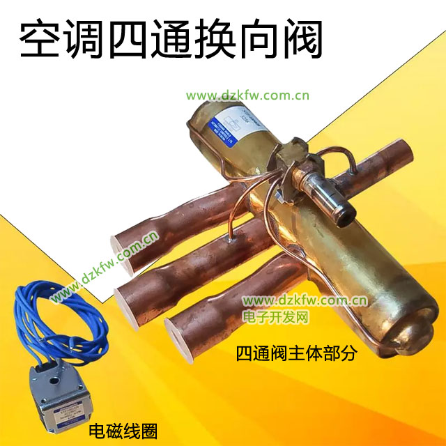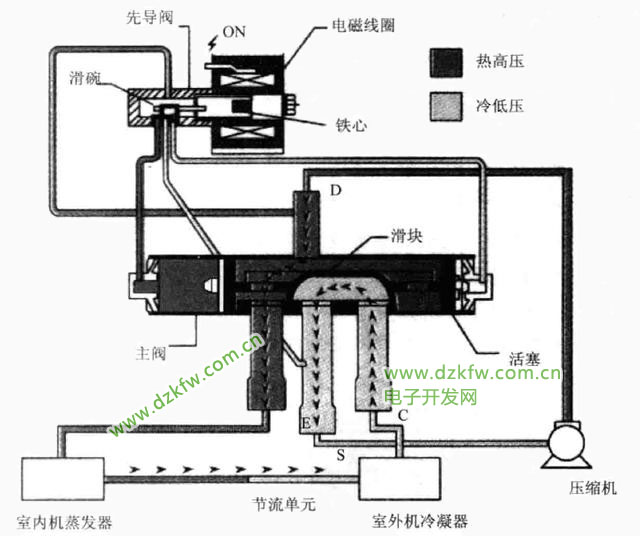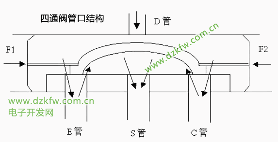 四通阀主要由电磁阀和阀体两部分组成。阀体又分为导阀和主阀,两者之间用毛细管连接在一起不能拆卸。在主阀的内部设置有橡胶材质的滑块,主要是用来切换管道的。