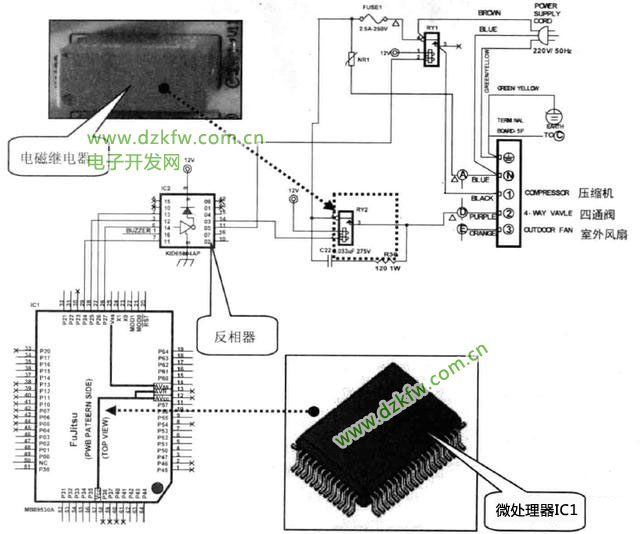四通阀控制电路主要由微处理器、反相器、继电器盒、四通阀等组成,如下图所示。若室内机发出制热命令,微处理器IC1芯片第28脚输出高电平的驱动控制脉冲信号,给驱动器IC2的第12脚,使其输岀一低电平驱动信号,触发继电器RY2动作,开关被吸合。使220V市电经过滤波后加到四通阀的电磁阀上,四通阀电磁阀通电后吸合。控制四通阀的活塞运动,使制冷剂改变流向,空调器开始制热。