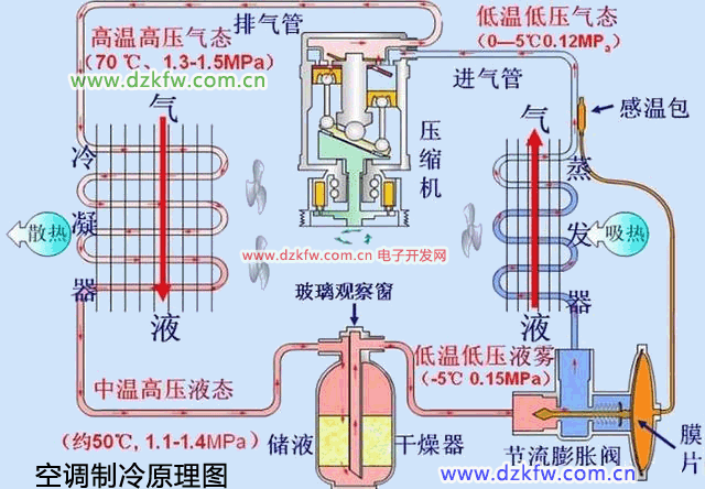 空调压缩机将气态的氟利昂压缩为高温高压的气态氟利昂,然后送到冷凝器(室外机)散热后成为中温中压的液态氟利昂,所以室外机吹出来的是热风。液态的氟利昂经毛细管,进入蒸发器(室内机),空间突然增大,压力减小,液态的氟利昂就会汽化,(从液态到气态是个吸热的过程),吸收大量的热量,蒸发器就会变冷,室内机的风扇将室内的空气从蒸发器中吹过,所以室内机吹出来的就是冷风;空气中的水蒸汽遇到冷的蒸发器后就会凝结成水滴,顺着水管流出去,这就是空调会出水的原因。然后气态的氟利昂回到压缩机继续压缩,继续循环。制热的时候有一个叫四通阀的部件,使氟利昂在冷凝器与蒸发器的流动方向与制冷时相反,所以制热的时候室外吹的是冷风,室内机吹的是热风。其实就是用的初中物理里学到的液化(由气体变为液态)时要排出热量和汽化(由液体变为气体)时要吸收热量的原理,同时蒸发热量。