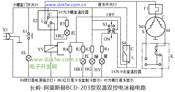 下图所示的是长岭-阿里斯顿BCD-203型双温双控电冰箱电路。S2为冷藏室温控器;S4为冷冻室温控器;EL为照明灯,安装在冷藏室的顶部,由冷藏室门开关S1控制;HY为黄灯速冻显示,由速冻开关S3控制;HG绿灯是电源指示灯;HR1红灯是冷冻室制冷显示,S4或S3接通时该灯亮,HR2红灯是冷蔵室制冷显示,由S2控制;K是电流起动继电器;YV为电磁阀;M为压缩机电动机。