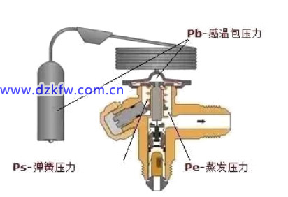 当感温包压力下降,导致 Pb < Ps+Pe 时,膜片向上移动,阀门关闭,流入蒸发器的剂减少。