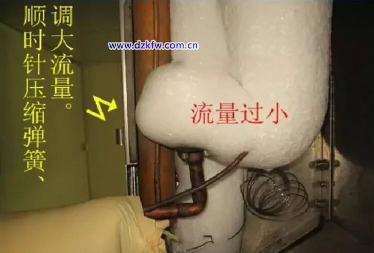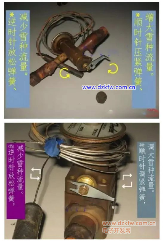 (4)如果膨胀阀阀体全部结霜,表明流量过小,应调大,也就是说要往压紧弹簧的顺时针方向调整。