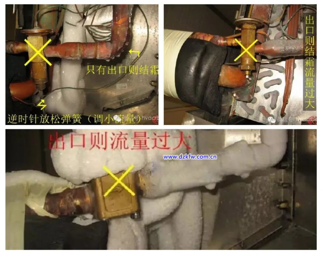 (1)如果膨胀阀阀体出口侧以及下部呈现45度斜状结霜,入口侧不应结霜,表明调整准确合适。