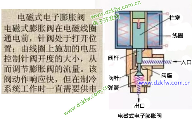电子膨胀阀是一种可按预设程序调节进入装置的剂流量的节流元件。它按照预设程序调节蒸发器供液量,因属于电子式调节模式,故称为电子膨胀阀。