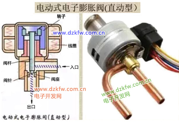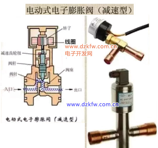 步进电机直接带动阀针的是直动型,步进电机通过齿轮组减速器带动阀针的是减速型。电动式电子膨胀阀采用电机直接驱动轴,以改变阀的开度。