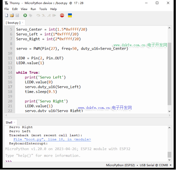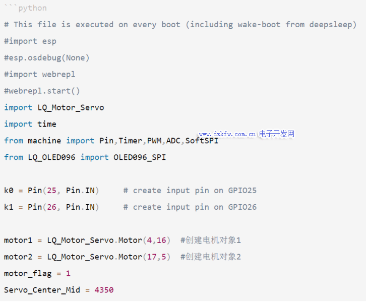最后, 我们讨论一下 MicroPython 开发嵌入式程序的特点。对于初学者需要注意三个方面的内容。第一个就是程序主题大体上呈现设置与循环两部分。在设置部分,往往需要 import 所需要的软件包、 对程序软件变量和硬件模块进行初始化等然后程序进入一个由 for 或者 while 语句构成的无限循环结构, 在这个结构中周期的执行一系列的指令, 完成控制的主要任务。第二部分就是需要理解程序中包含有一些与硬件相关的变量、对象等。它们需要不停的进行循环刷新和幅值,这些实时变量的值反映了单片机外部端口的电压信号, 或者通讯数据等, 通过前面的循环结构进行周期的读取或者赋值。 最终形成对外部电路的控制。