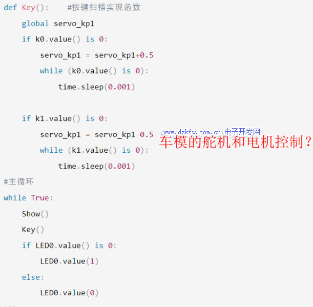 这里以无线电轨智能车综合测试程序为例, 来说明一下 MicroPython 程序的特点。对于初学者来看, 这个程序显得有点复杂,但在整体上, 大家看到, 它分为前后两部分。 前面部分属于 Setup 初始化部分, 做了很多的硬件初始化, 也定义了一些函数。后面一部分,就是有 while 形成的 循环控制部分, 这些属于软件的后台任务部分。在每一次循环中依次执行 OLED 屏幕的刷新,按键的检测处理,以及控制板上 LED 的闪烁, 用于显示程序运行状态。此时估计大家会有一个疑问, 车模运动中舵机和电机控制代码在哪里执行呢?