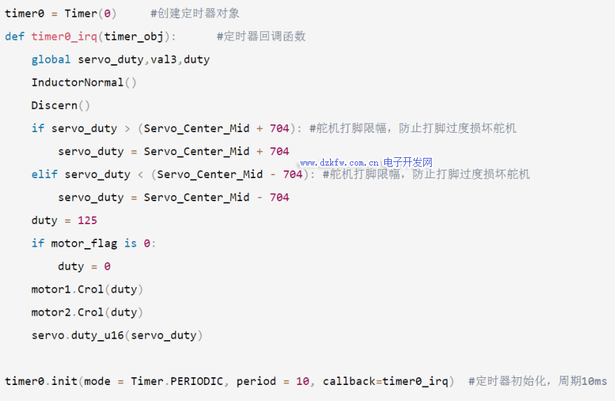 为了解决这个疑问, 大家看这个综合演示程序的中间部分,在这里定义了 ESP32 硬件定时器对象, timer0,接下来定义了一个函数, 用于定时器中断函数后面是对定时器进行初始化,设置定时器工作模式为周期中断模式,中断周期为 10毫秒, 也就是100Hz 的重复频率,第三个参数设置中断服务程序。这个程序就是前面定义的 timer0 irq 函数。因此这个中断程序就会在 Timer0 的中断驱动下, 每隔精确的 10毫秒, 就被执行一次。 中断程序属于嵌入式软件的前台任务。 中断程序定义了中断任务这些是需要用到的全局变量, 和程序中其它函数进行信息传递。读取电磁场传感器的交流电压值判断赛道的属性计算舵机偏移量对舵机偏移量进行限幅下面就是设置电机运行速度和舵机偏移量。中间部分是用于控制电机是否运行的逻辑。之所以利用中断周期进行车模控制, 主要是为了保证控制时间的精确和周期的稳定。 这要比在 while 循环中执行控制命令更加可靠。
