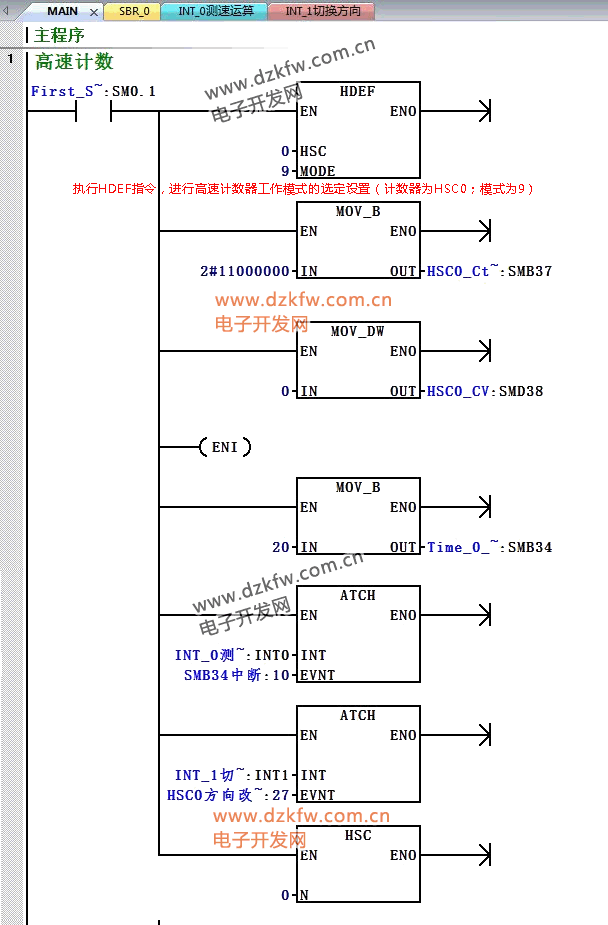 主程序需要编写高速计数每20ms读取一次计数值,(高速脉冲HDEF指令和中断程序运用)如下所示: