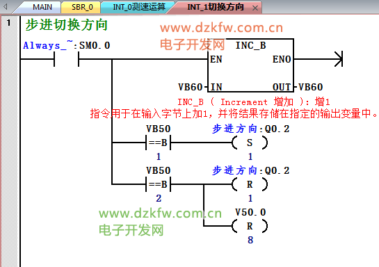 由于方向要实时根据编码器旋转方向而改变,所以在向导中没有组态方向,而需要利用高速计数方向改变中断来切换方向,程序如下所示: