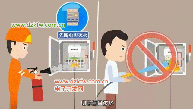 灭火方法:电气火灾先断电,再用干粉或二氧化碳灭火器,严禁用水。