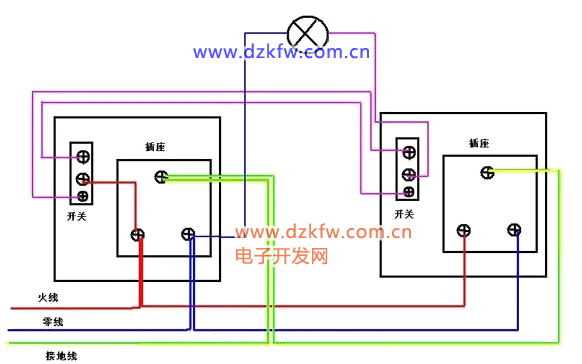 插座接线:左零(N,蓝色)右火(L,红/黄/绿),上接地(PE,黄绿双色)。