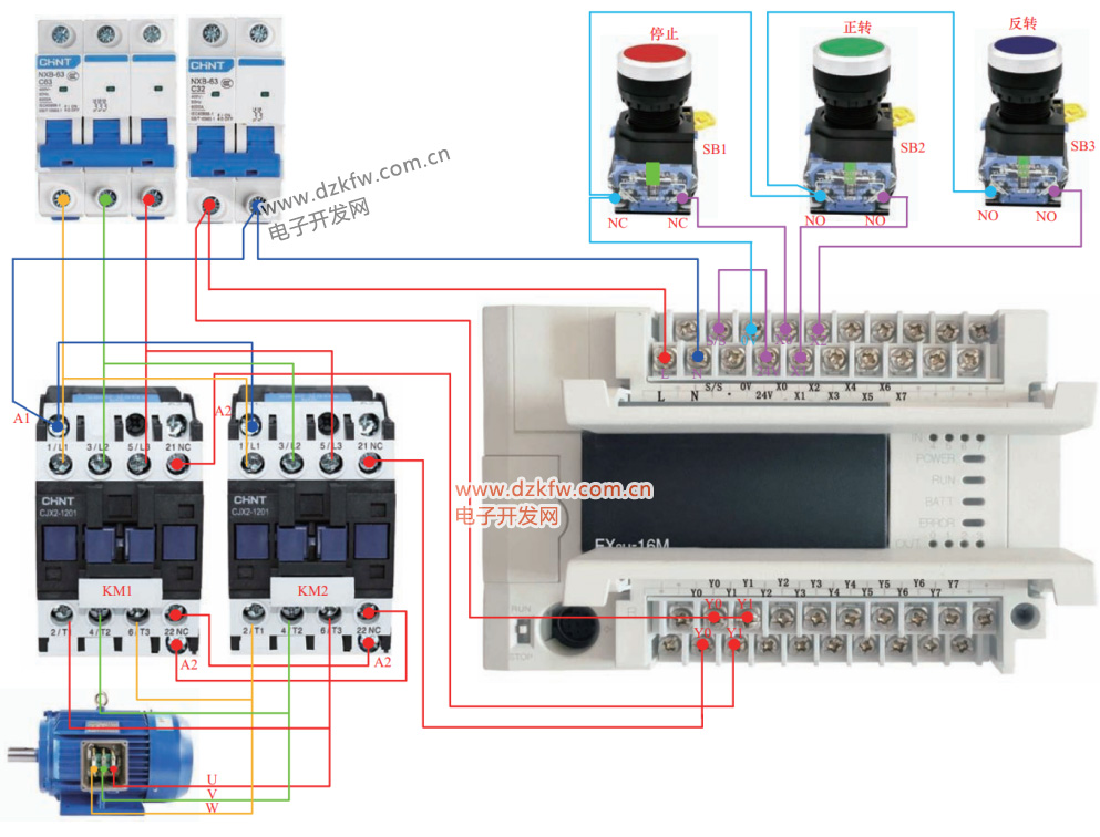 三菱FX3U PLC电机正反转控制、复合连锁电路实物接线图