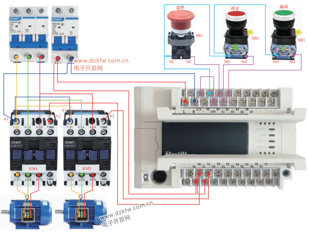 三菱FX3U PLC控制两台电动机同时起动顺序停止电路实物接线图