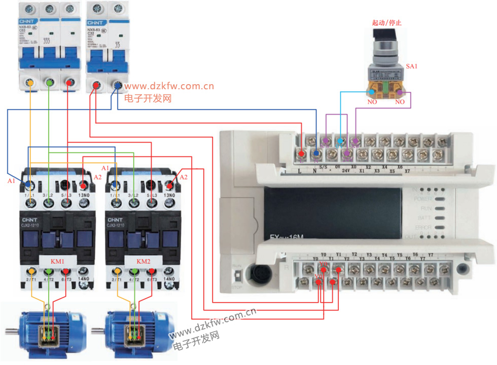 三菱FX3U PLC控制两台电动机交替循环运行电路实物接线图