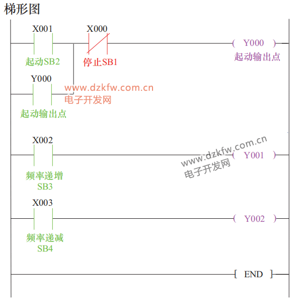 三菱FX3UPLC通过变频器控制电动机起停、加减速电路梯形图