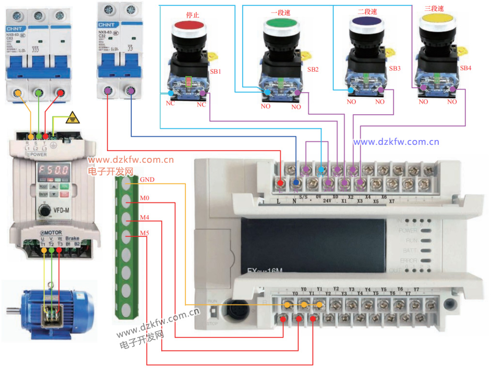 三菱FX3U PLC通过变频器控制电动机三段速运行实物接线图