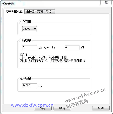 内存容量:即系统的容量大小,包括注释容量,文件寄存器容量和程序容量的总和。如上图所示,内存容量设置为16000步,大小为32000个字节。