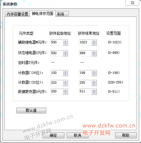 由上图可以看出,在辅助继电器(M)、状态继电器(S)、定时器(T)、计数器(C)、数据寄存器(D)元件设置范围内, PLC掉电时,它们的值会自动保存到AutoShop系统文件中,用户可以防止异常情况下对PLC中数据的损坏。