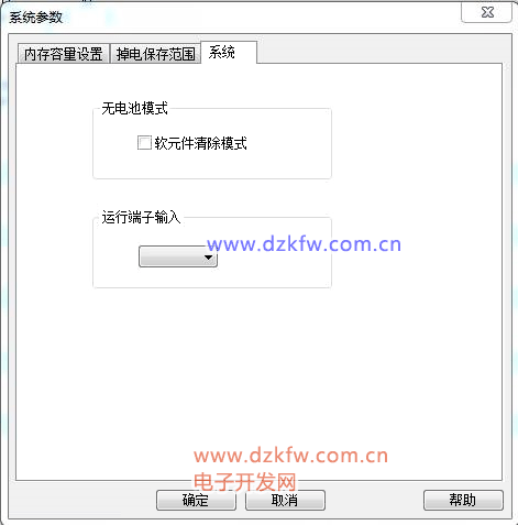 无电池模式: 设置PLC的运行模式,选上单选按钮即为无电池模式,反之为有电池模式。
