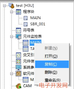 在工程管理窗口中用右键点击元件监控表,在弹出菜单中选择”复制“,如下图所示: