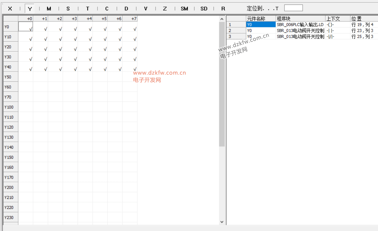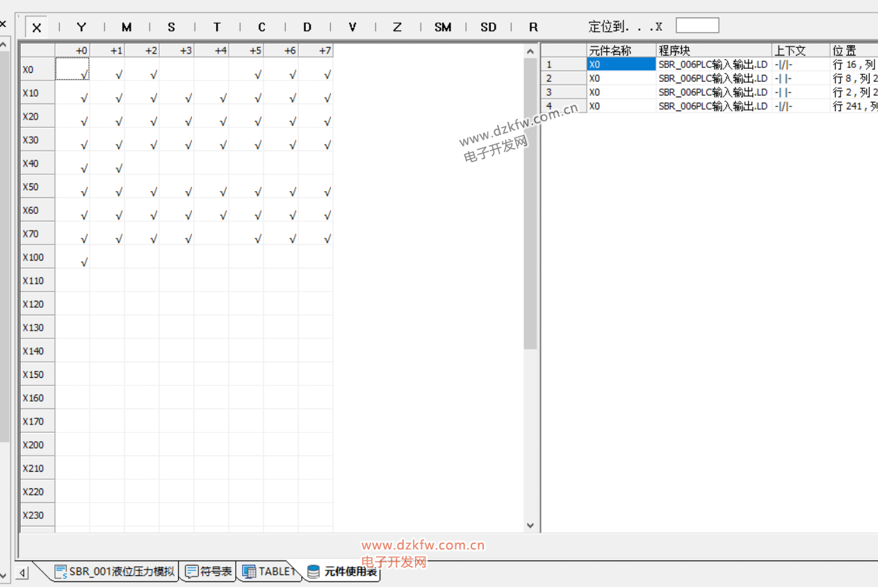 从图中看出:元件使用信息表的左边部分将程序中使用到的软元件给标注出来(用"√"表示);点击表上方的元件按钮,可切换到相对应的元件使用信息;如果想快速定位到某个软元件的位置,可在表上方的编辑框中输入元件地址,再按回车键,即可定位到表中相应的位置。