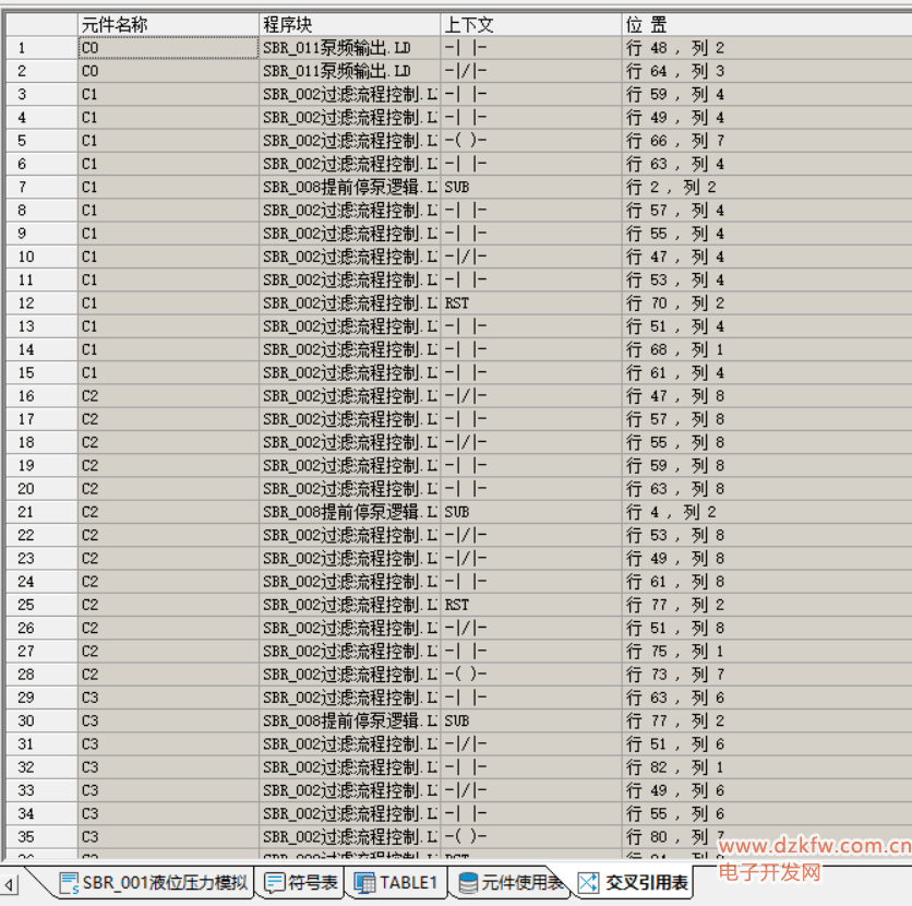 系统提供交叉引用表供用户查看,表中记录了元件在各个程序中的使用情况,双击交叉引用表中的某条记录或者在右键菜单中选择“元件定位”,可以定位到该元件所在的程序和行列。