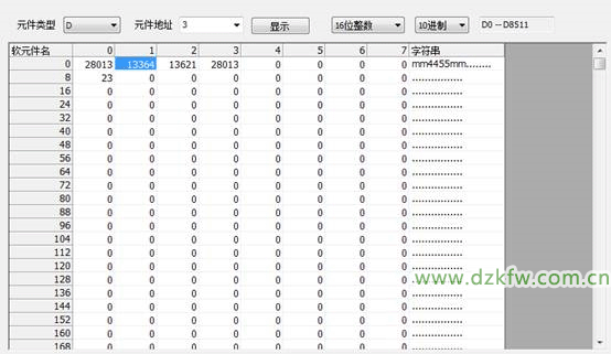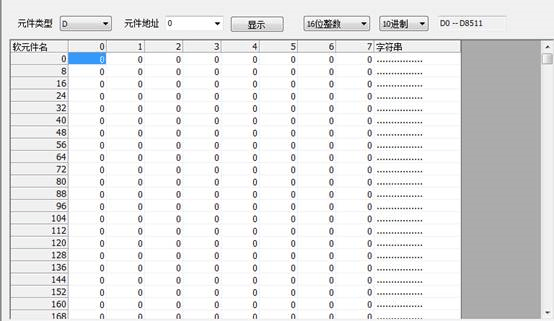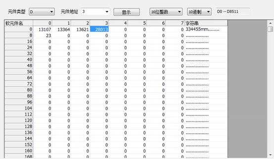 如上图所示,在“软元件名”后的编辑框中输入元件名后,按回车键,或点击“显示”按钮,系统将会定位到对应的D元件 所在的位置,并高亮显示。如下图: