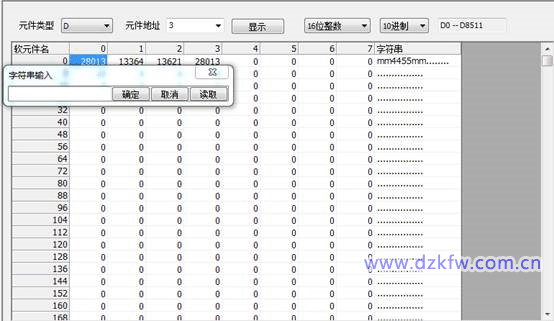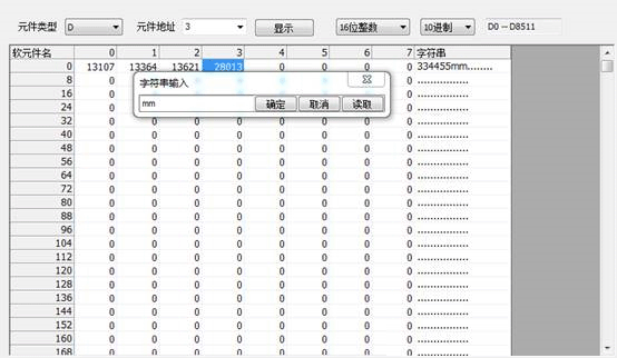 还是以D0元件为例,当双击D0元件所在的单元格,会弹出字符串输入对话框,点击对话框上的“读取”按钮, 在编辑区域中便会显示D0数值所对应的字符串内容,如下面连个图所示: