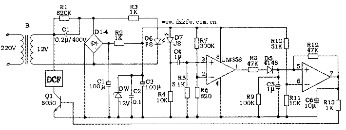 电路中,供电电源采用变压器降压方式,加到水龙头的电压仅为l2V,对使用者不存在安全隐患。l2V交流电压一路经R3限流,将50Hz的交流电提供给发射光电管D6工作;另一路经全波整流稳压电路,将电压稳压到12V,供后续电路工作用。当接收光电管D7接收到微弱的人体反射光信号后,将其转换成半波脉动直流电信号,该信号经C4耦合到第一级运放的正输入端(3脚)进行放大,2脚负输入端加入一个小的偏置电压,防止小信号干扰。从3脚输出放大后的信号经过R8、D5、C5整形和平滑处理成为直流信号,送到第二级运放的5脚正输入端作为电压比较器,比较器的翻转电压由第二级运放6脚负输入端外接的R1O、R11分压值决定oRl2是运放的正反馈电阻,与C5、C6共同构成延时电路,防止人体活动时信号中断产生断续供水现象。当第二级运放级7脚输出高电平时三极管Q1导通,控制电磁阀DCF打开水源。