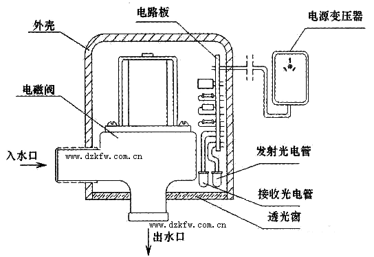 右图是供参考的结构示意图。电磁阀、电路板等部件体积较小,简单制作时,可以用一截长70mm、50的PVC管材制作外壳。