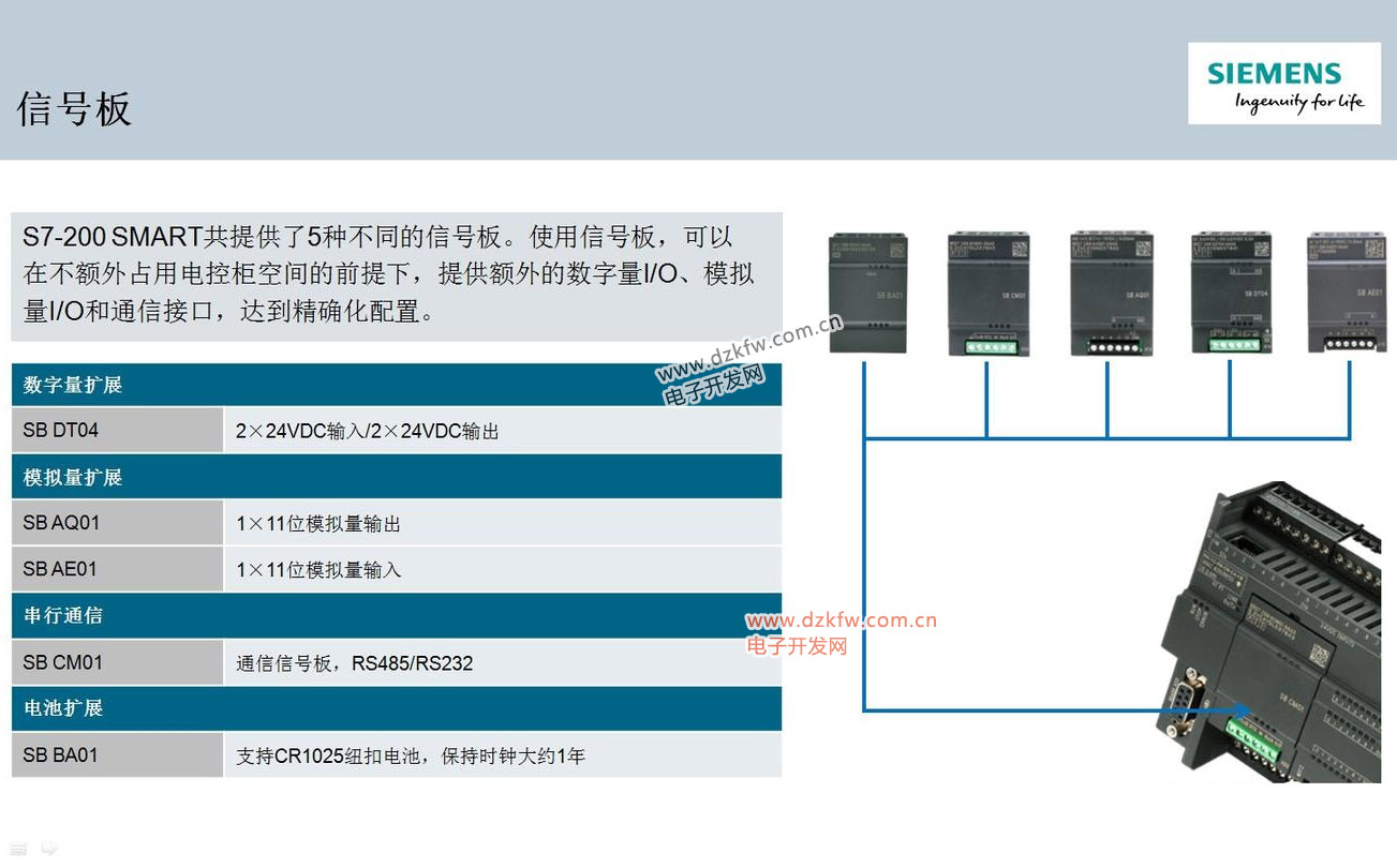 S7-200 SMART共提供了5种不同的信号板。使用信号板,可以在不额外占用电控柜空间的前提下,提供额外的数字量I/O、模拟量I/O和通信接口,达到精确化配置。
