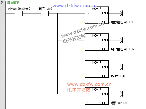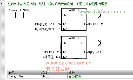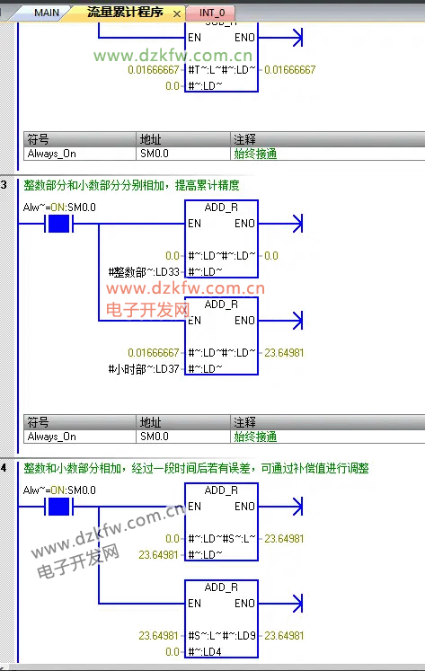 3、流量累计子程序。为了提高精度,提取流量的整数部分和小数部分,整数部分和前一时刻的整数相加,小数部分和前一时刻的小数相加,然后整数和和小数和累加在一起。