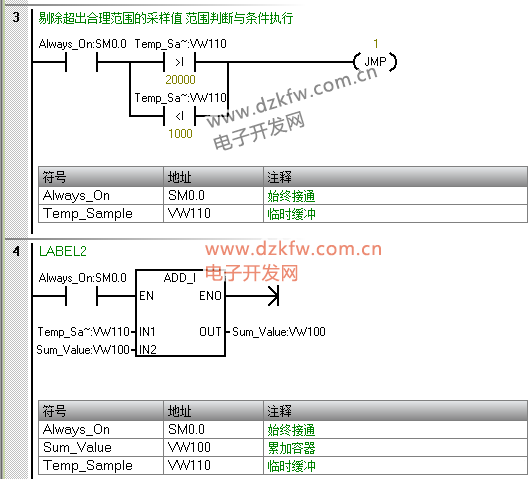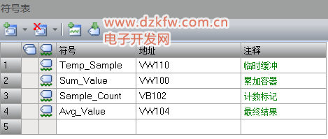 “累加容器” 作用:存储 10 次采样值的总和,需持续保留直到计算完平均值;地址选 VW100:与其他变量(Sample_Count、Avg_Value)连续分配(VW100~VW104),方便后期监控时 “批量查看滤波相关数据”(不用在分散地址间切换)。 |