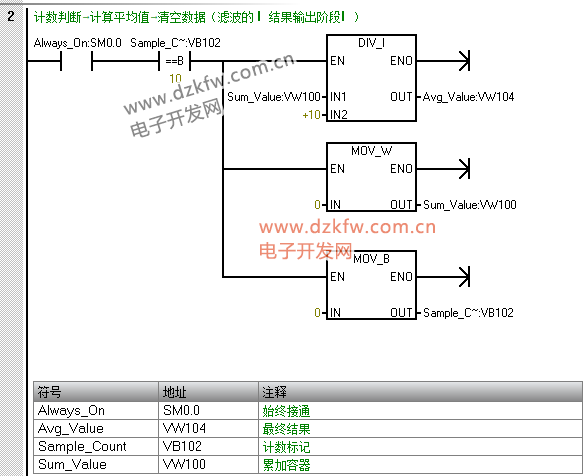 “计数标记” 作用:记录已采样次数(1~10),计数到 10 时触发平均值计算;数据类型用 BYTE:仅需计数到 10,BYTE(0~255)完全足够,比 INT 节省 1 个字节内存(工业项目中变量多时,内存优化很重要);地址 VB102:刚好是 Sum_Value(VW100=VB100+VB101)的下一个字节,地址连续,逻辑清晰。 |