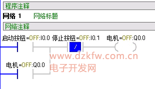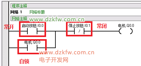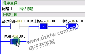 在这个程序中,在启动按钮按下后,能流通过常闭按钮到达电机Q0.0。这是Q0.0位置的常开触点闭合,实现自锁保持。这时I0.0恢复常开状态,能流将从下方的线路流过,保持电器的启动状态。