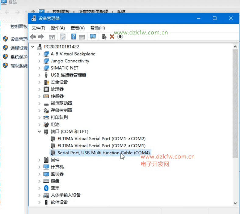 通过查看电脑的设备管理器可以查看COM端口是否连接成功,COM4显示连接成功。用此来测试PLC程序写的是否正确。