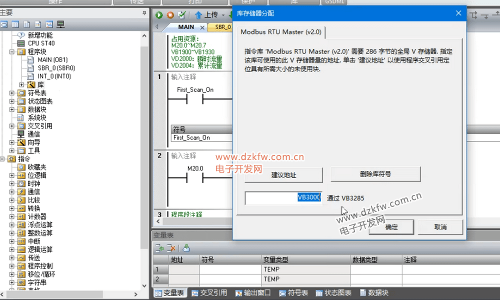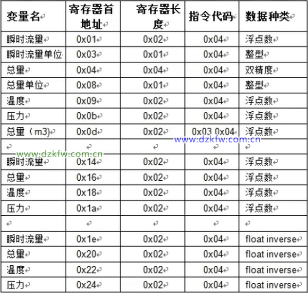 流量计RS485通讯地址表。通过地址表可以看出,PLC要读取的数是瞬时流量【30021,16进制的14就是20,再加上起始地址30001】;另一个总流量【30023,16进制的16就是22,再加上起始地址30001】