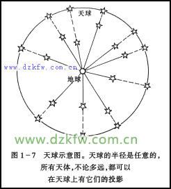 天空呈球形,这是有目共睹的。众星列宿布满天空,对于这些极其遥远的天体,人眼无法分辨它们的相对远近,似乎是等距的。它们同观测者的关系,犹如球面上的点同球心的关系。