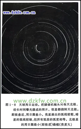 天体周日运动行经的路线叫周日圈。从图1-8中可以看出,天体愈近天极,其周日圈愈小;离极愈远,周日圈愈大。