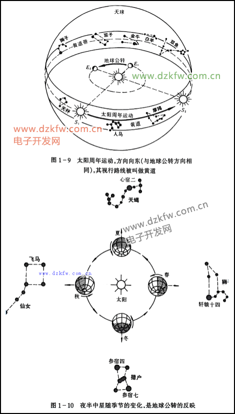 夜半中星不断改变,证明太阳在恒星间不断移动。例如,北半球的观测者在每年春分(3月21日)夜半,看到狮子座中天。这时,从地球的另一侧看来,太阳在天球上位于飞马座方向(图1一10)。