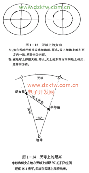 例如,牛郎星和织女星的角距离约为35°(图1-14)。图1-14天球上的距离牛郎和织女在地心天球上相距35°,它们的空间距离16.4光年,无法在天球上反映出来。