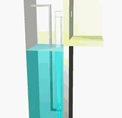 这次模拟的水泵,如图2.5所示,是由抽水管(5厘米见方)和送气管(2厘米见方)构成。送气管的前端,两两错列地设置了四个空气的流入口。水泵浸入水下1米深处,要把水汲取到比水面高出10厘米的容器里去。每个空气流入口,每隔0.1秒注入流量为25L/min的空气。呈现在图2.6里的是模拟的结果。图中以等值面来表示,使气液界面可视化。混有空气的水被抽取上来,成水花状注入到容器里去,重现了水泵的工作状态。图2.7所示是抽水管中心断面的气液分布图。蓝色部分表示水,白色的为空气。根据此图,抽水管中的流动可以判断为塞状流(slag flow),您的看法呢?