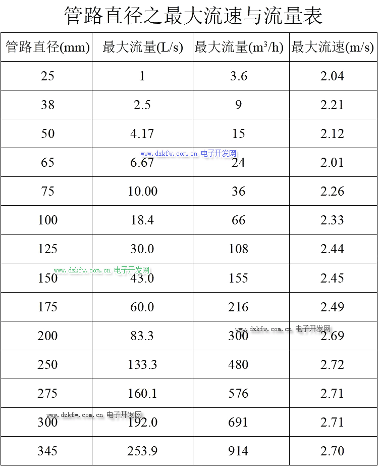 许多计算反坡排水的朋友苦于管道的选择,提供一个管道直径最大流速与流量表,仅供大家参考!