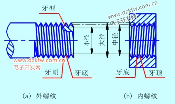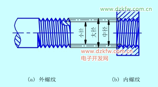 与外螺纹牙顶或内螺纹牙底相切的假想圆柱(或圆锥)的直径称为大径,与外螺纹牙底或内螺纹牙顶相切的假想圆柱的直径称为小径,母线通过牙型上沟槽和凸起的宽度相等的地方的假想圆柱的直径称为中径。
