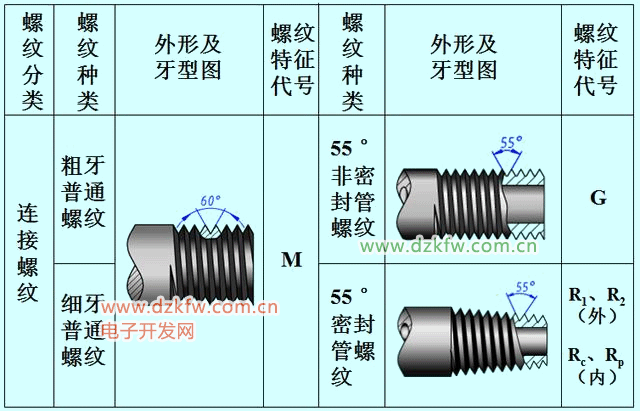 在通过螺纹轴线的剖面区域上,螺纹的轮廓形状称为牙型。在工程图样中,螺纹牙型用螺纹特征代号表示。下图为常用螺纹的分类、代号、外形以及牙型。比如最常用的普通螺纹代号为M,生活中最为常见;55度非密封管螺纹G、55°密封管螺纹,在管路连接中较为常用。这些都为连接螺纹,用于连接紧固的场合。传动螺纹用于传动系统中传递动力。